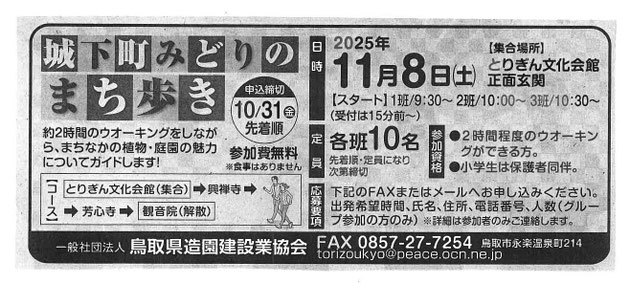 11月8日(土)に鳥取市内をウォーキングしながら庭園の魅力や植物を紹介する