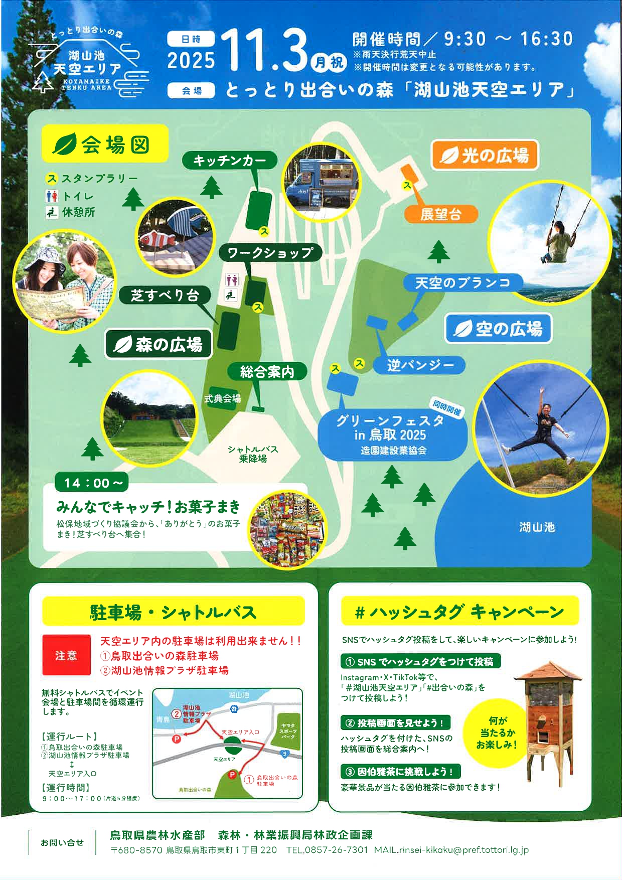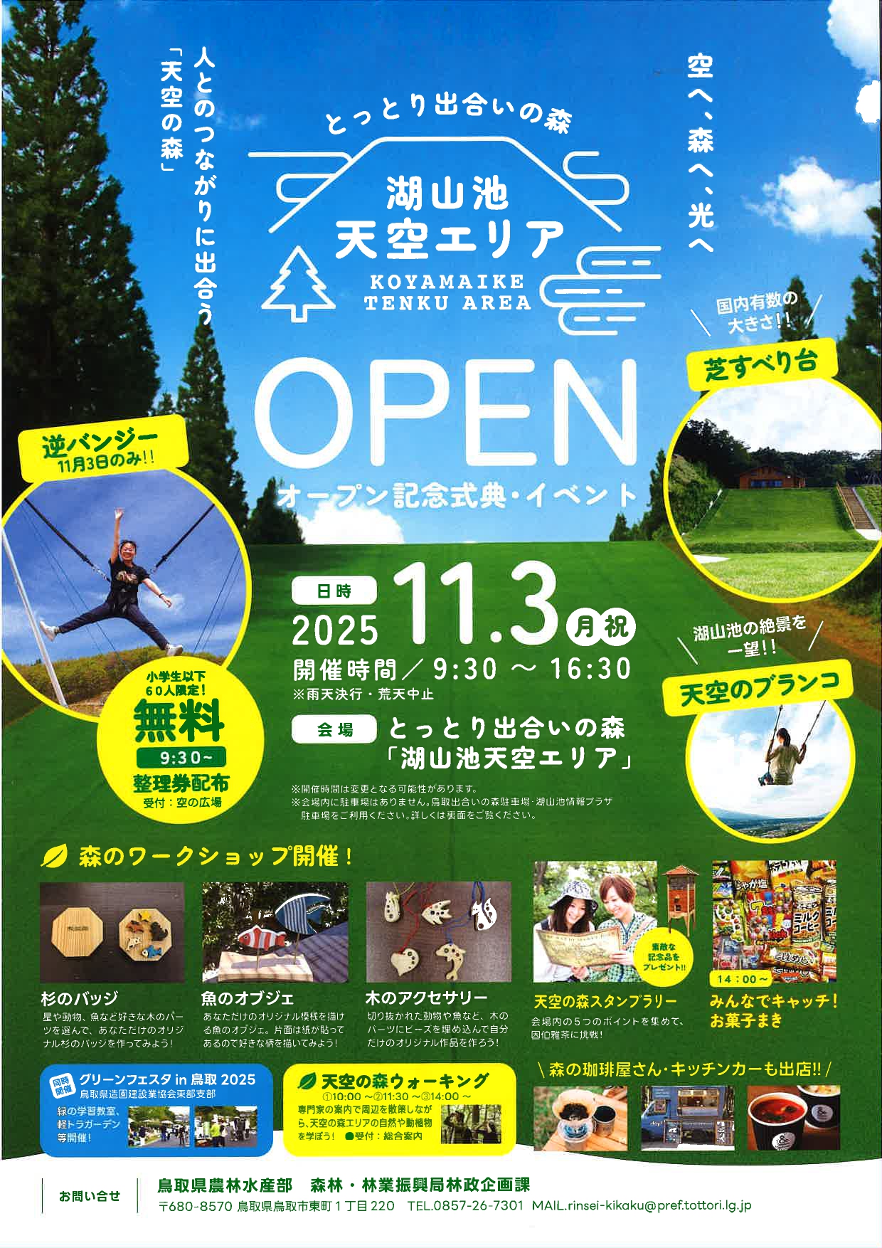 とっとり出会いの森の湖山池天空エリアオープン記念式典に合わせてグリーンフェスタin鳥取(花と緑のフェア)を2025年11月3日(月・祝)に開催します。